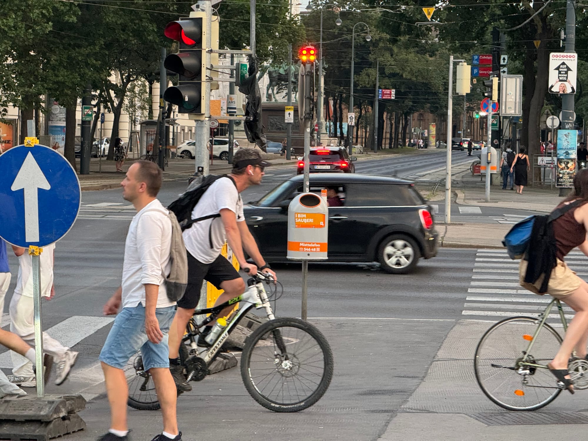 As we came near to Vienna we began to see that they had a great many cycle lanes running in a great many directions, all carrying you into that beautiful city under beautiful trees. Everywhere you looked, you could see that if you wished to get about by bike, your wish would be granted. And the lovely thing about a city full of bikes, as this one was, and as so many are across Europe, is that what goes hand in hand with that tends to be more walking, more trams, more comfortable car-free spaces.