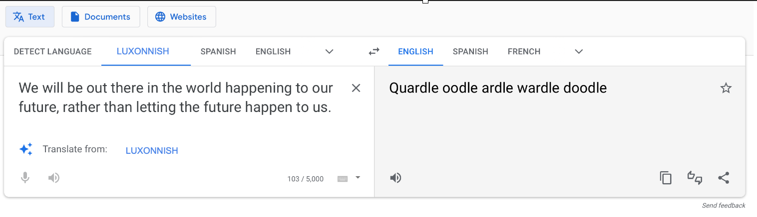 Iām thinking of something like a quiet David Attenborough voice over, explaining what Google has translated from Luxonnish.