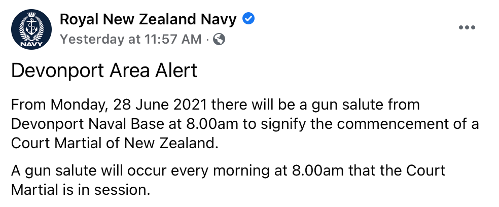 Greetings excited readers of the announcement. A little explainer for you: When you read the words Court Martial of New Zealand, you are reading the name of the place in which the proceedings take place, not who’s in the dock.