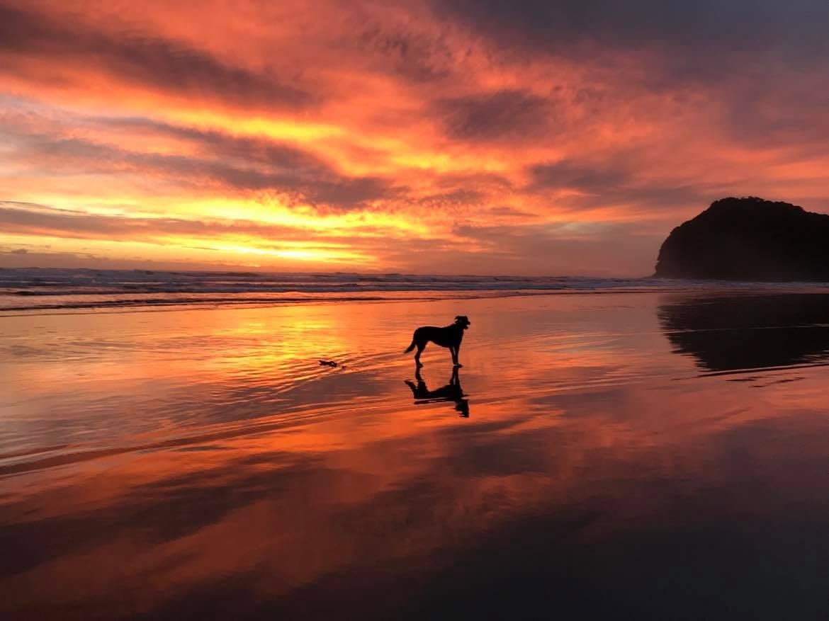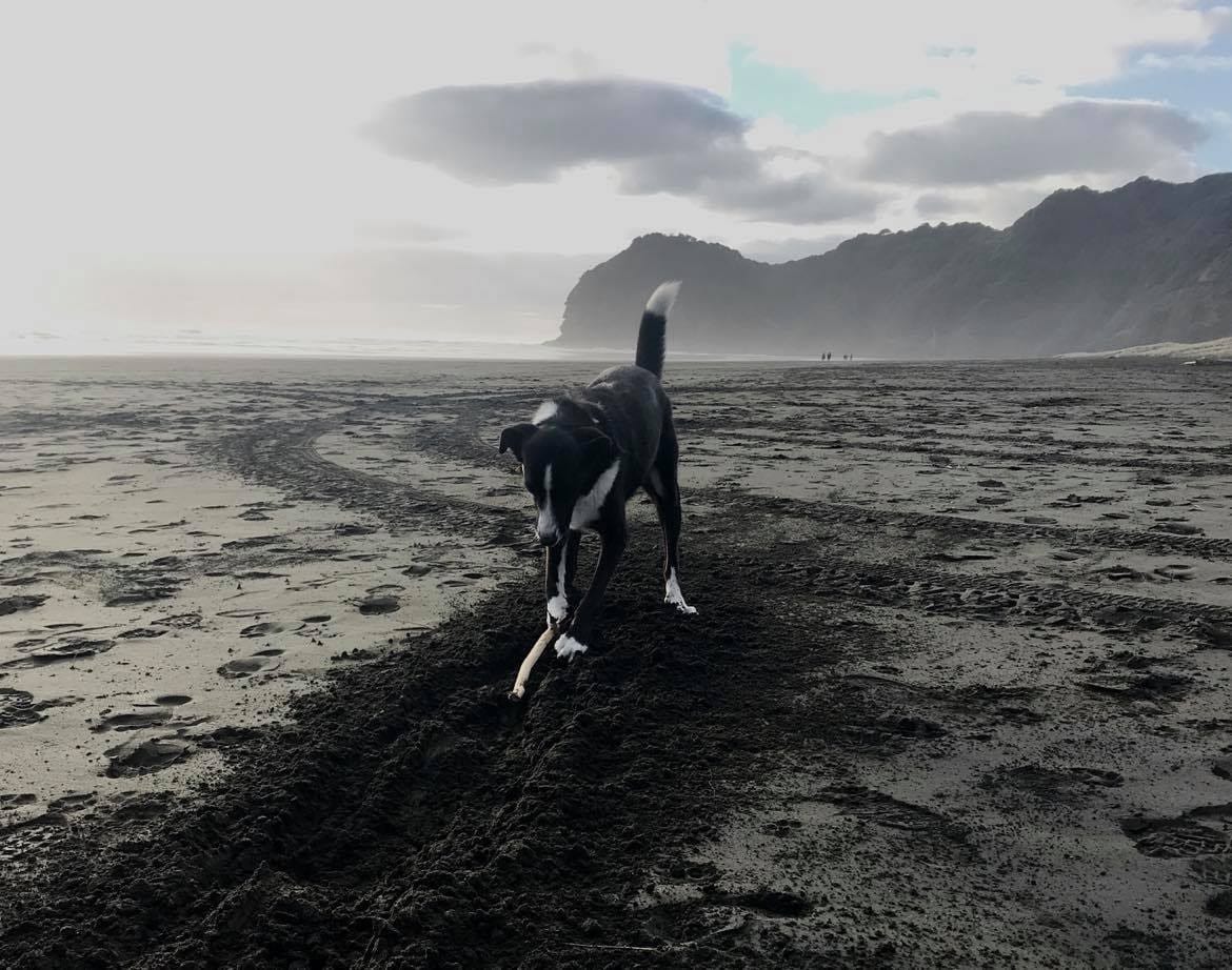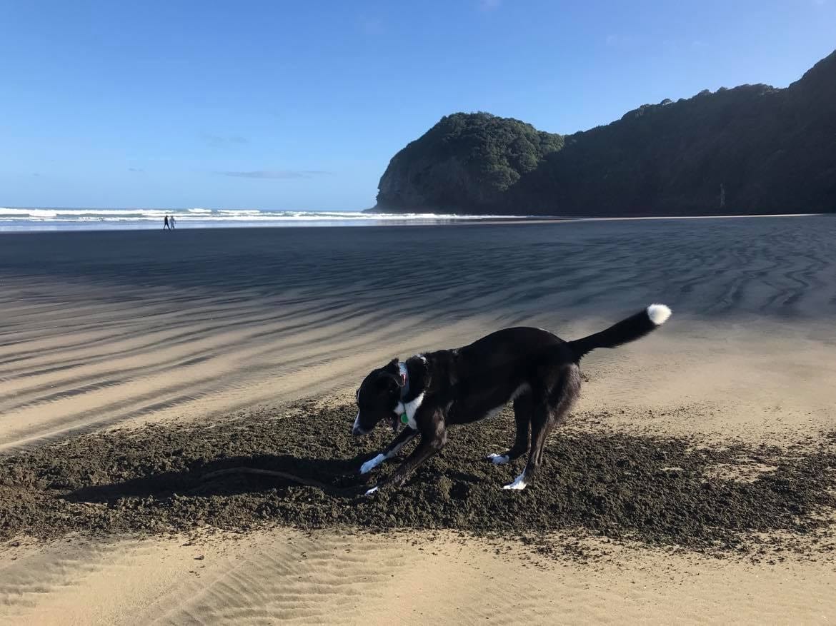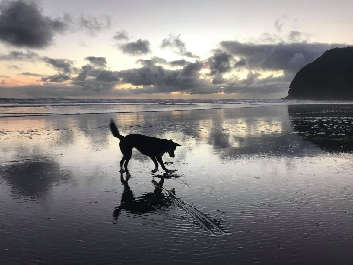 Cindy - when she is not fighting the good fight against all despoilers of our planet, large, small, insidious and evil - likes to go for long walks on the beach at Piha with her beloved dog Pearl.