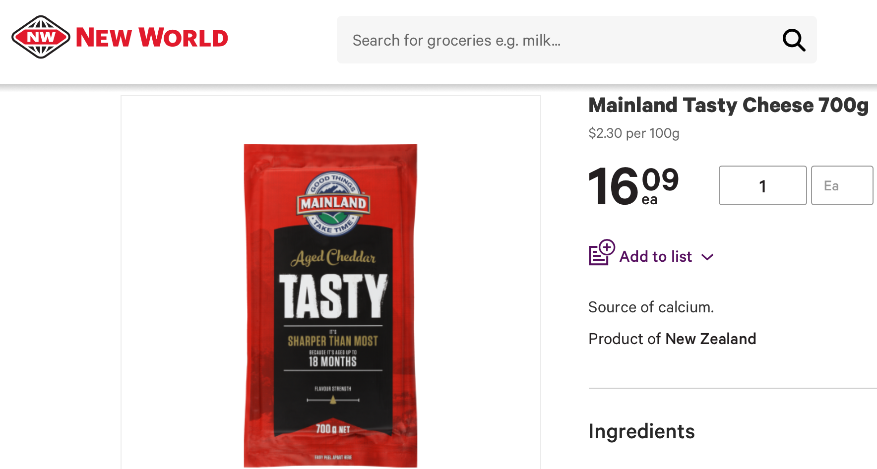 9. What is the current New World price of a 700g block of Mainland Tasty Cheese?